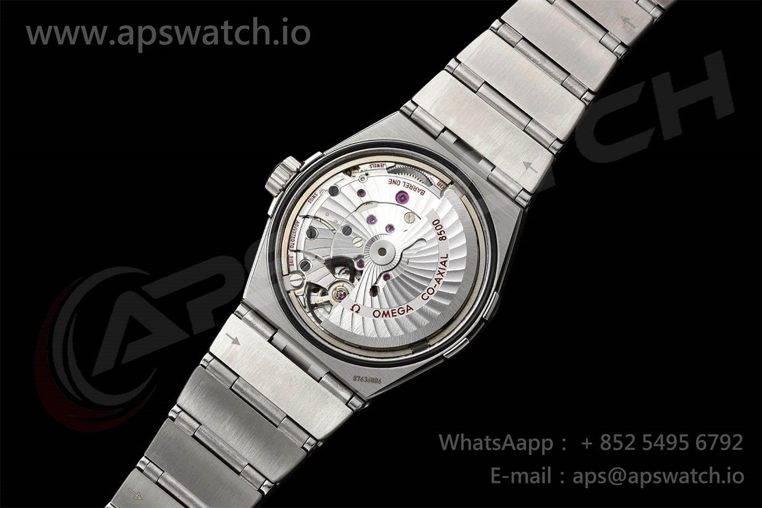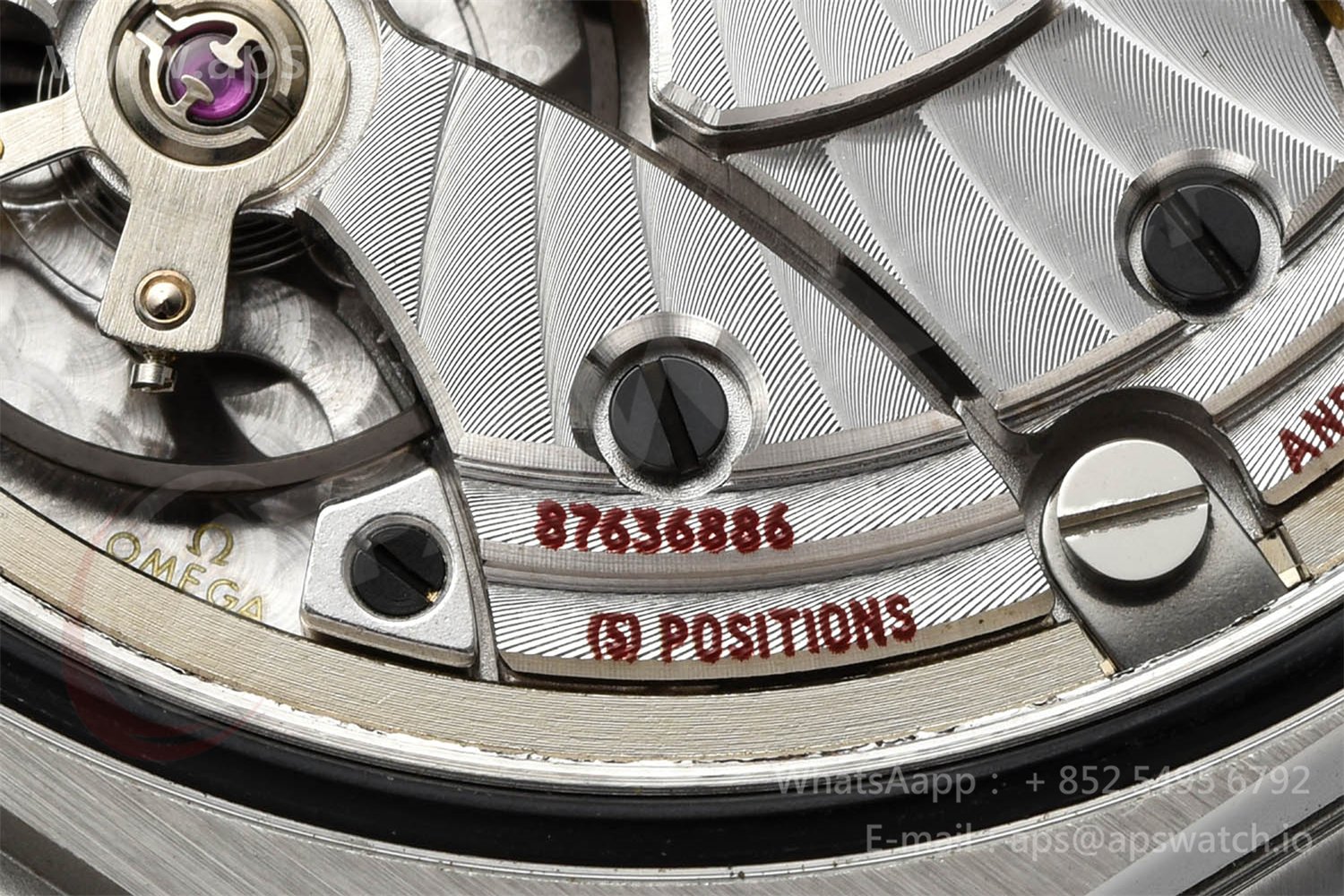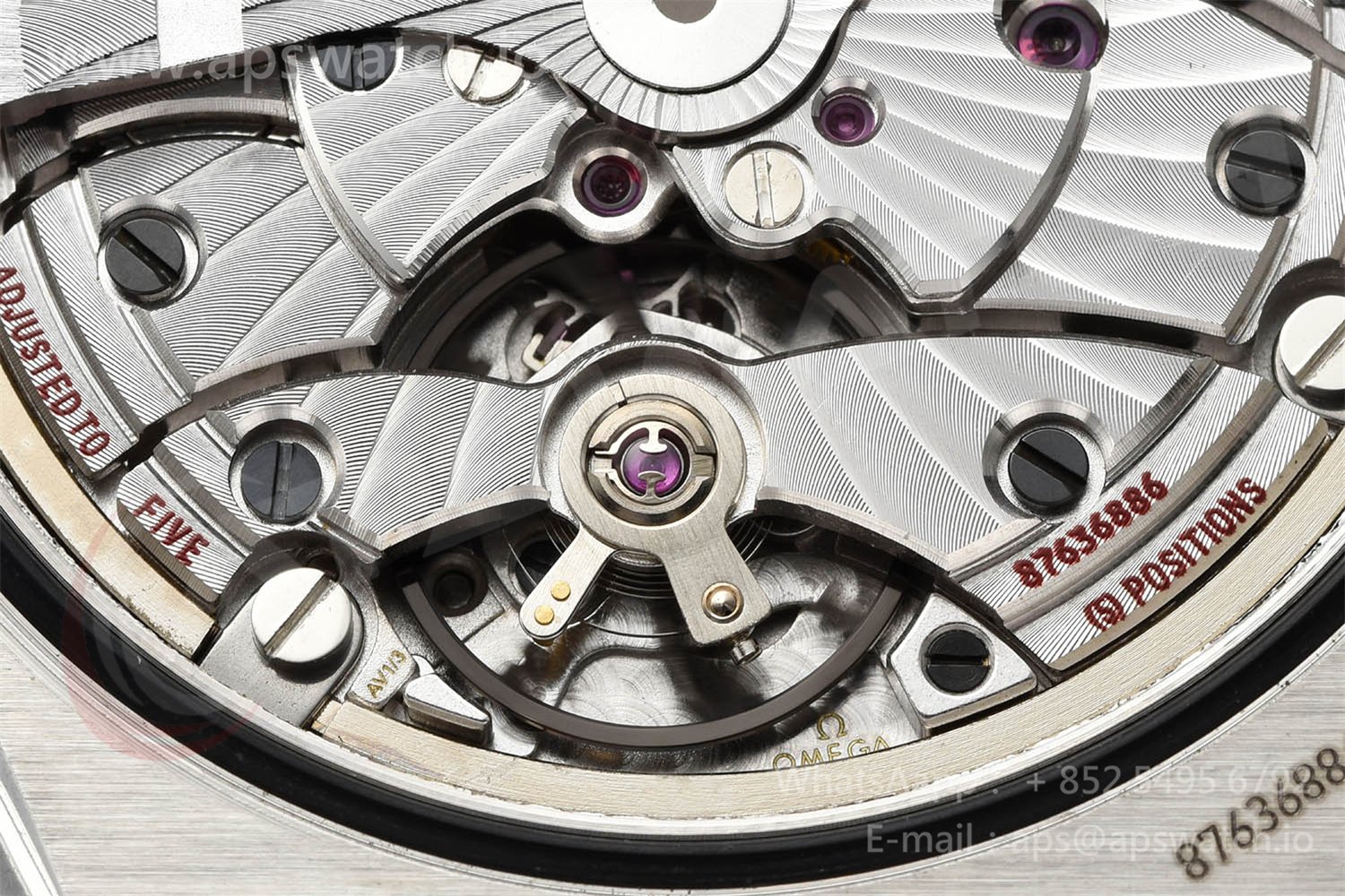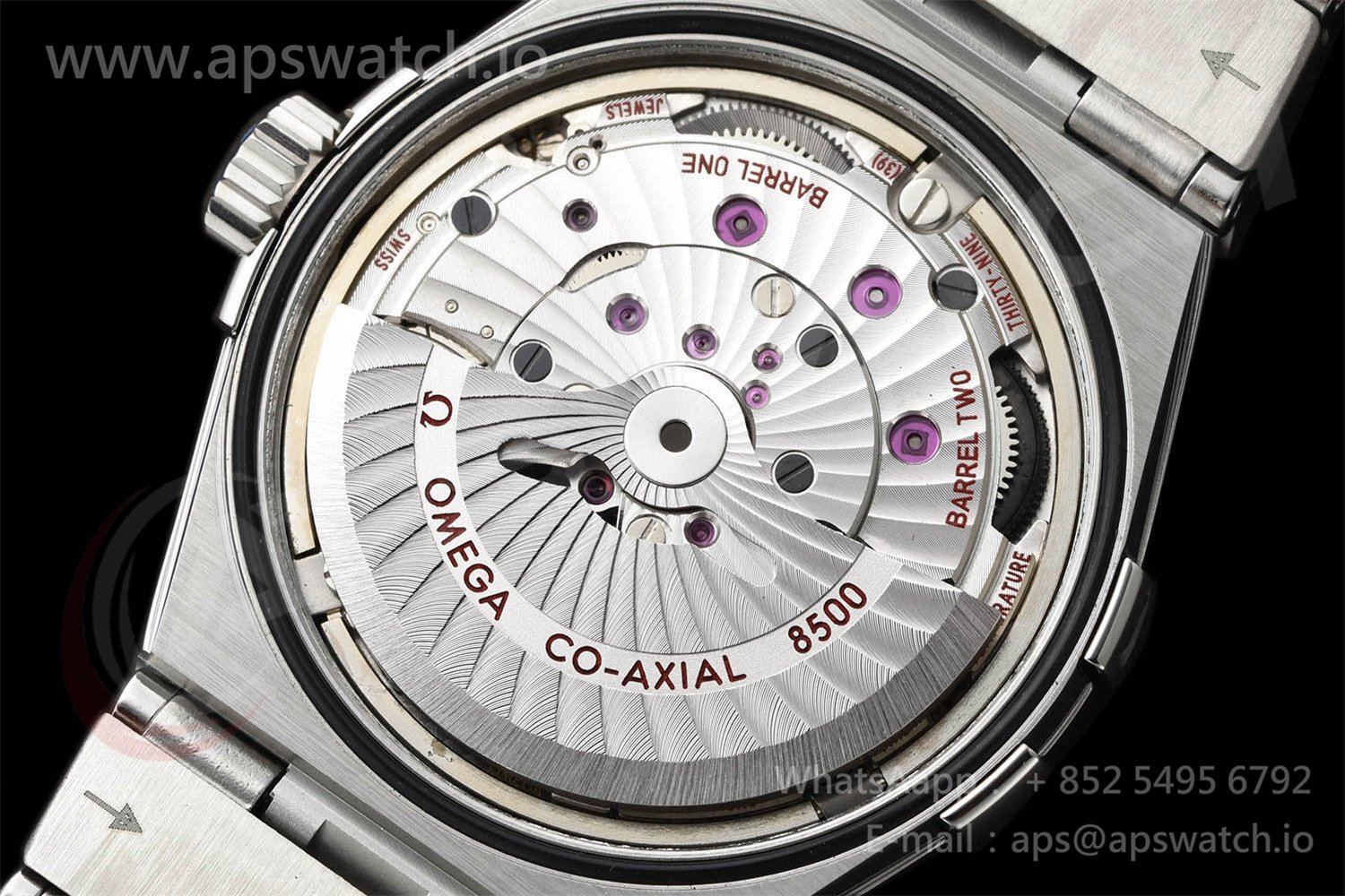 | Movement | Platinum Plated Super Clone Asia A8500 Automatic, Decorated insignia rotor, All markings of Omega Calibre 8500 present | ||