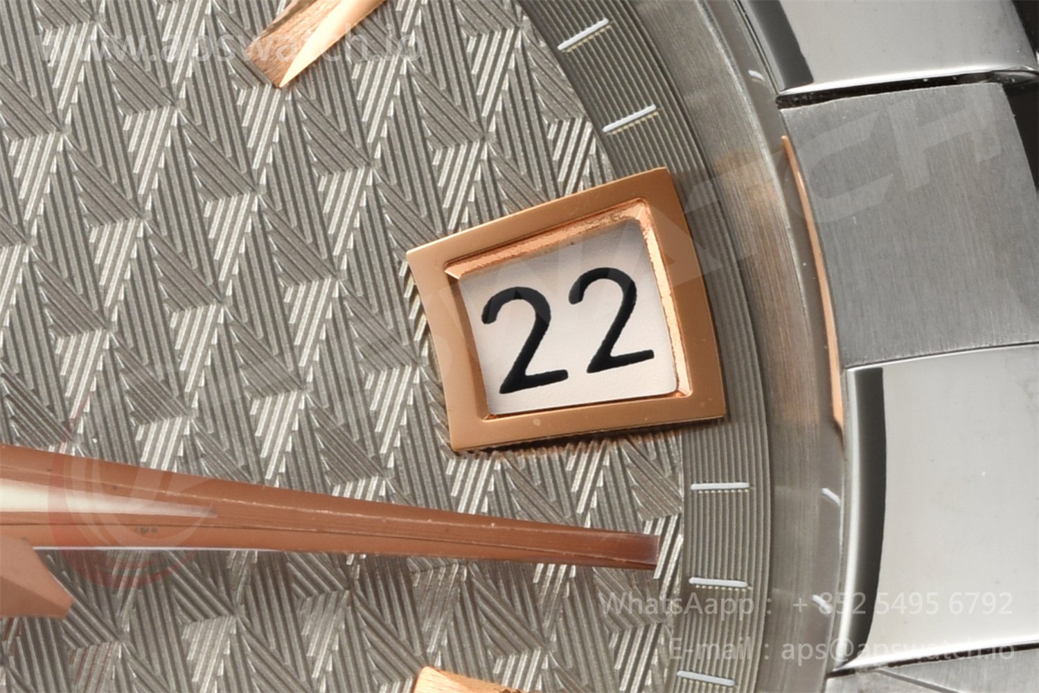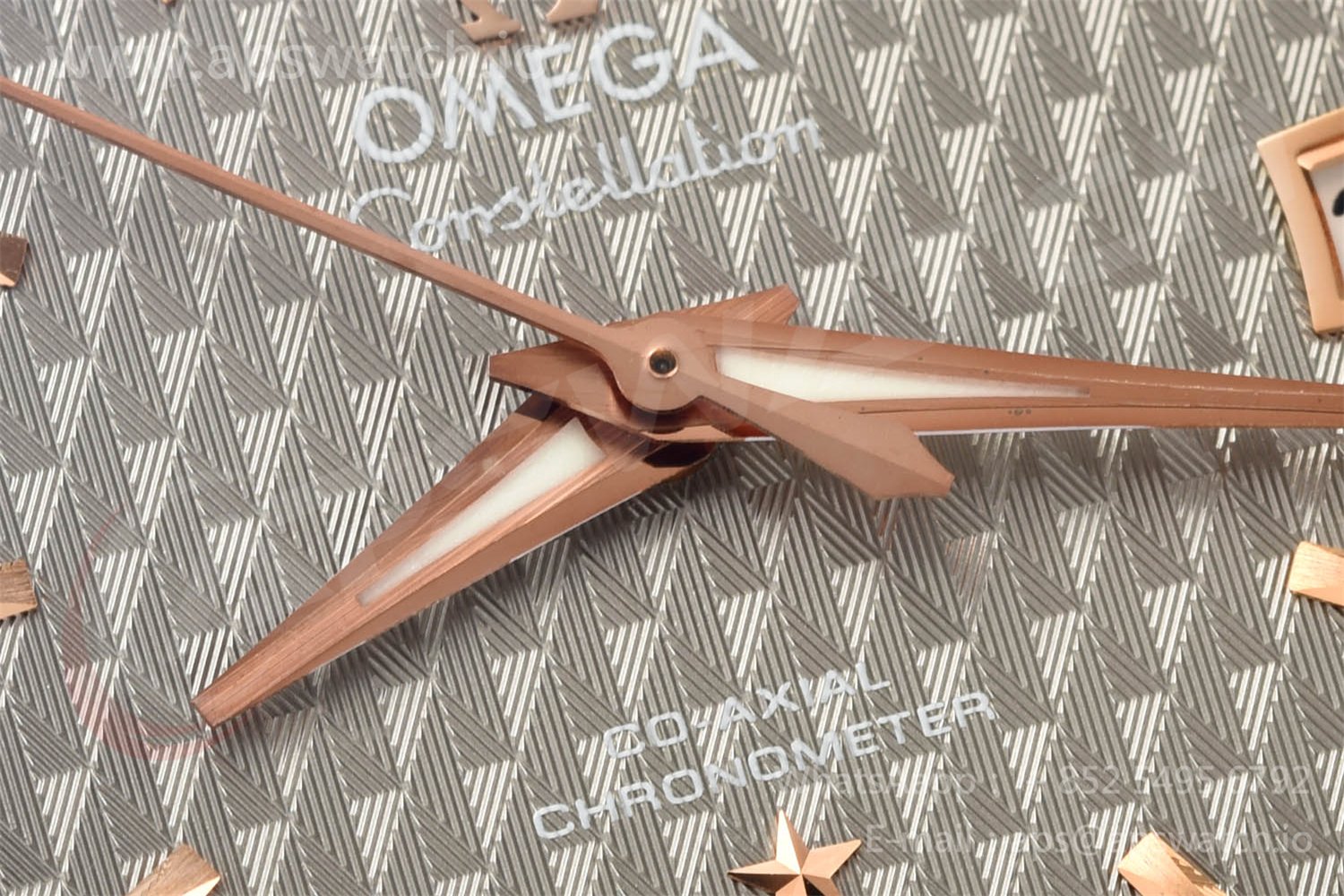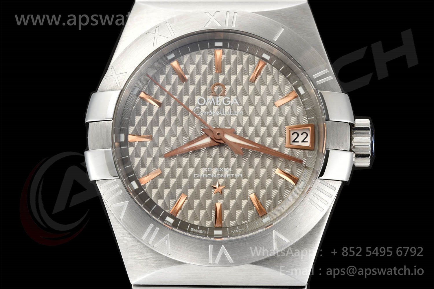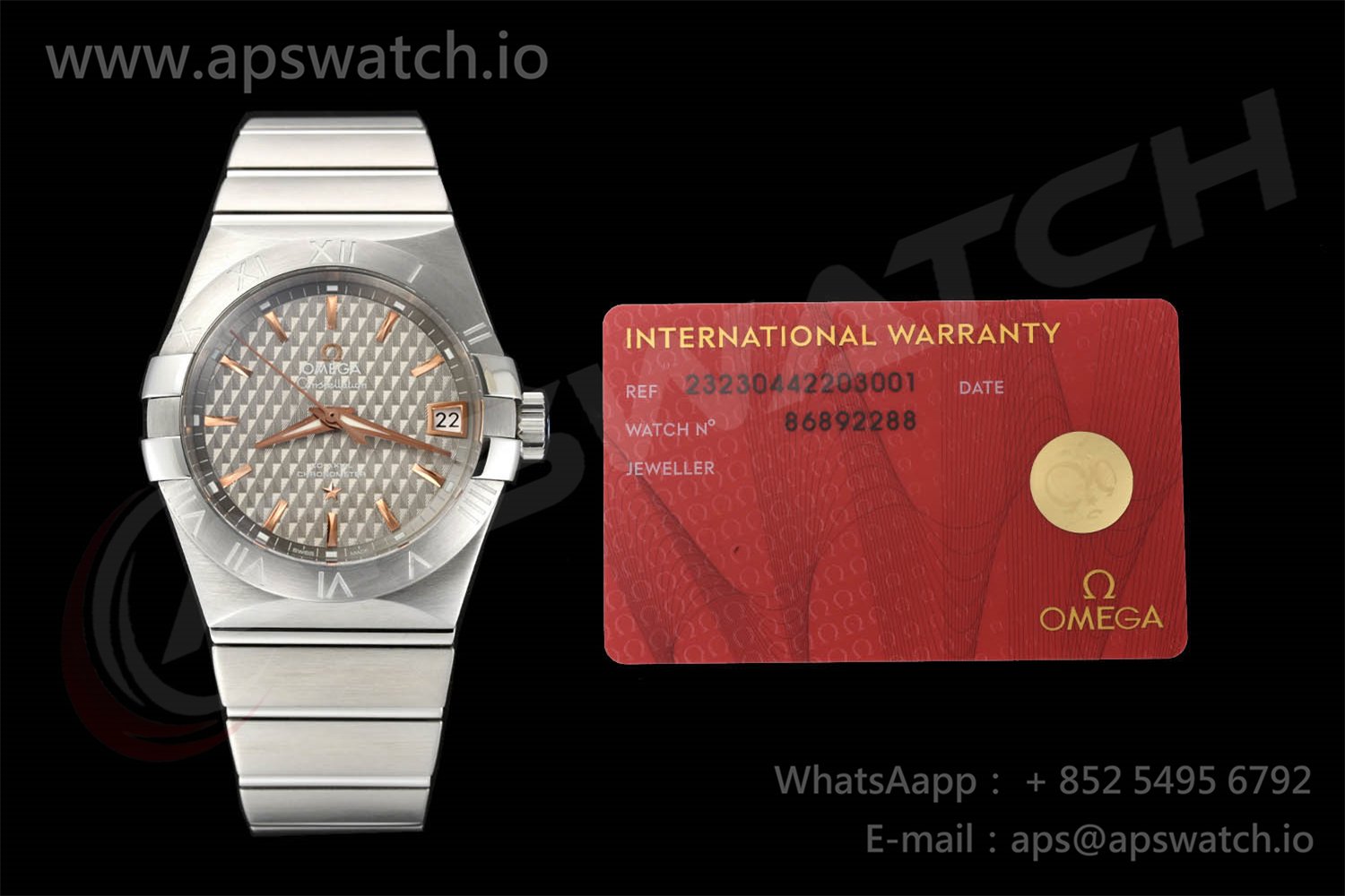 | Movement | Platinum Plated Super Clone Asia A8500 Automatic, Decorated insignia rotor, All markings of Omega Calibre 8500 present | ||
