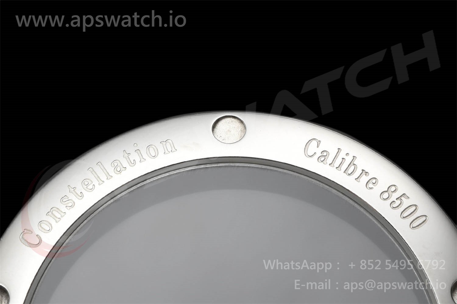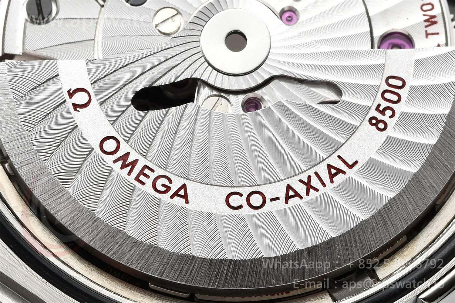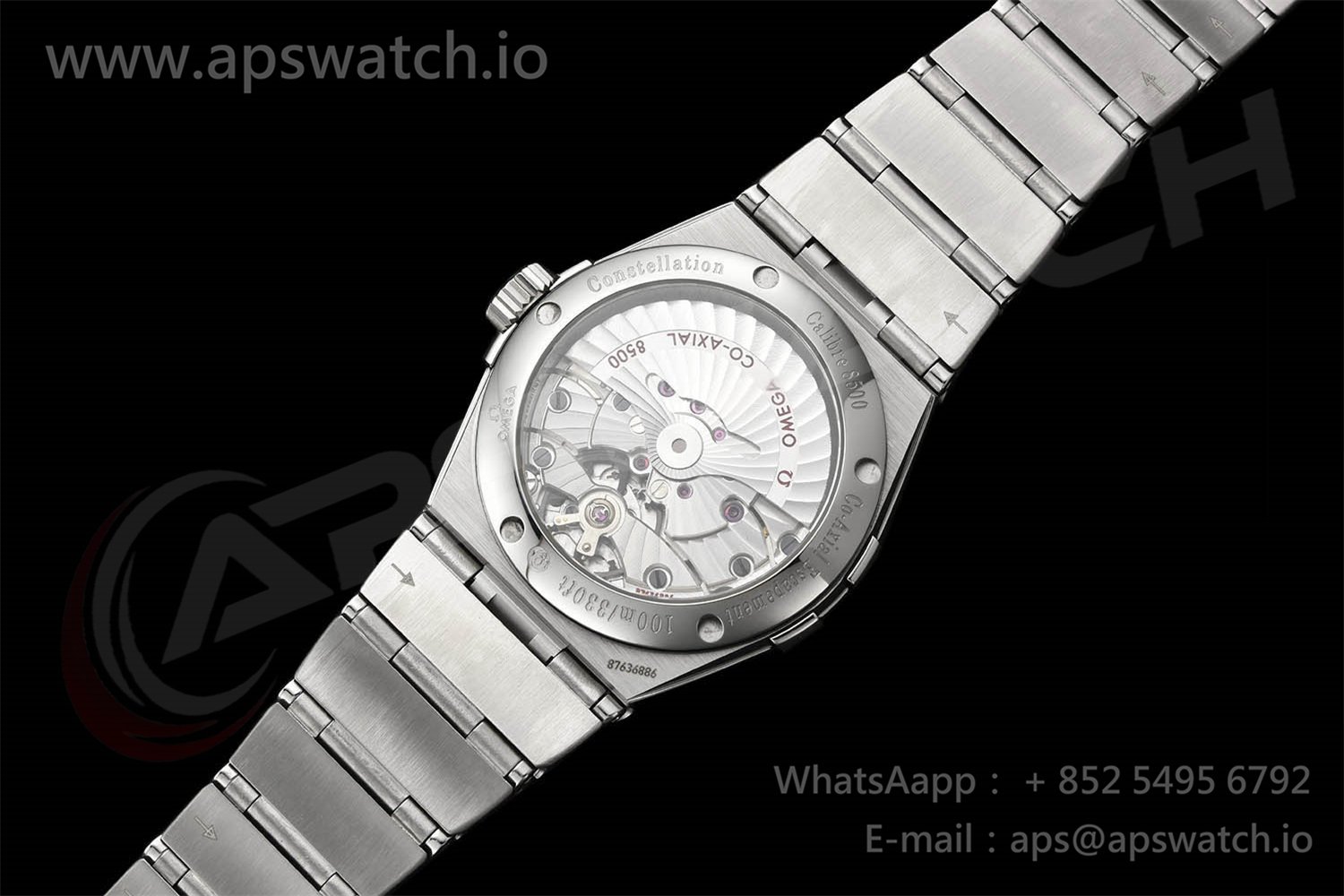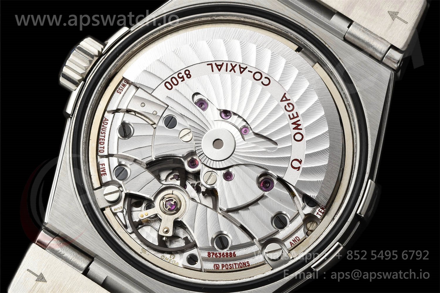 | Movement | Platinum Plated Super Clone Asia A8500 Automatic, Decorated insignia rotor, All markings of Omega Calibre 8500 present | ||